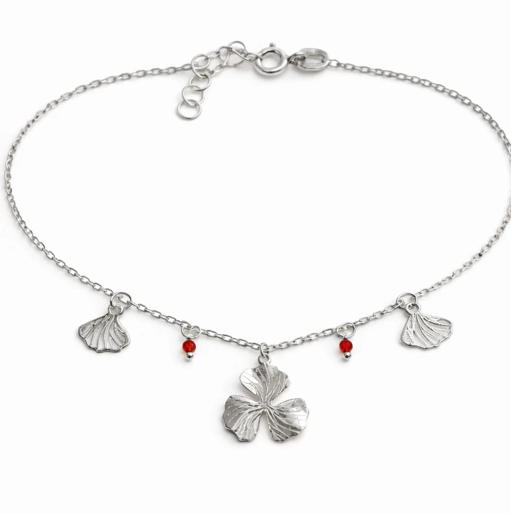 Bransoletka srebrna z kwiatem i czerwonymi kamieniami
