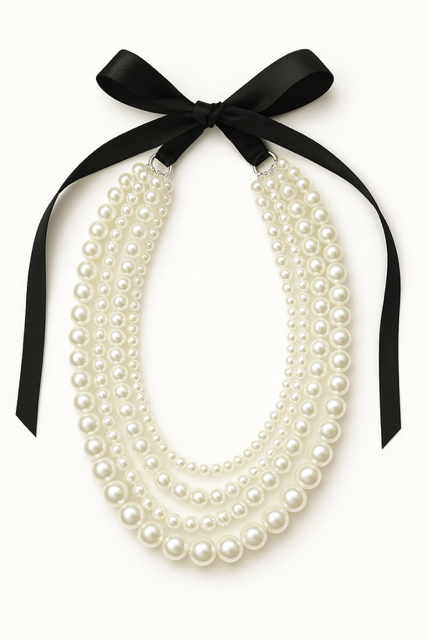 Składa się z czterech sznurów sztucznych pereł o różnej wielkości – subtelnych i delikatnych oraz większych, efektownych koralików – które razem tworzą harmonijną i szykowną całość. Naszyjnik jest wiązany czarną wstążką co dodaje uroku.