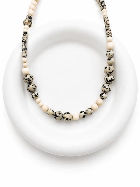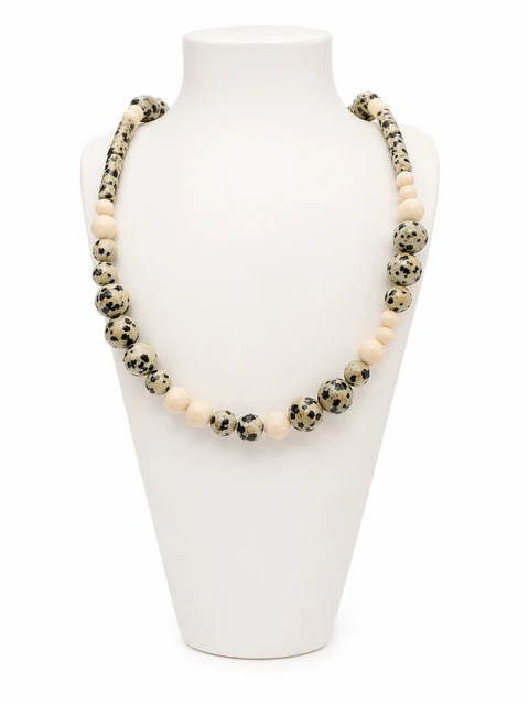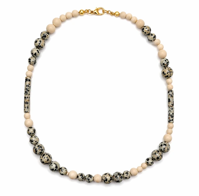 Naszyjnik został wykonany z mieszanki naturalnych kamieni o różnych kształtach i odcieniach – od beży i kremów, przez ciepłe brązy, aż po subtelne zielenie i szarości.