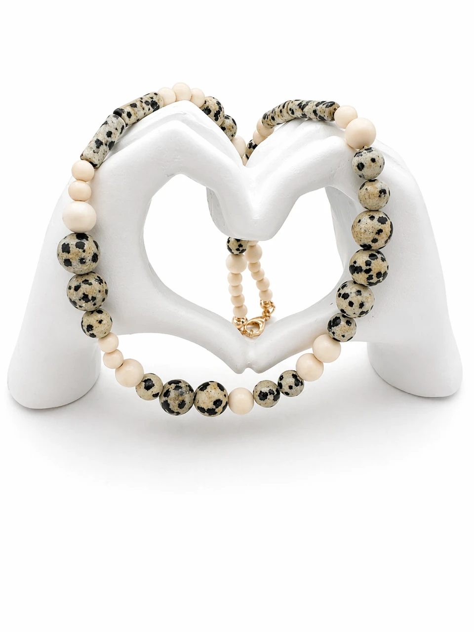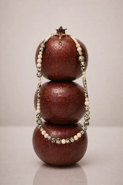 Każdy element jest niepowtarzalny, co sprawia, że naszyjnik handmade z kamieni naturalnych wyróżnia się indywidualnym charakterem. Złote akcenty nadają całości elegancji i podkreślają naturalne piękno kamieni.